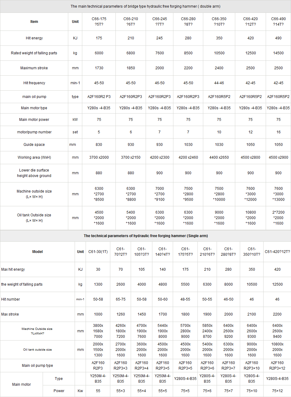+Hydraulic forging hammers have two types: hydraulic free forging hammer and hydraulic die forging hammer. and hydraulic free forging hammers also have two types: one is double arm hammer ,the other is single arm hammer.