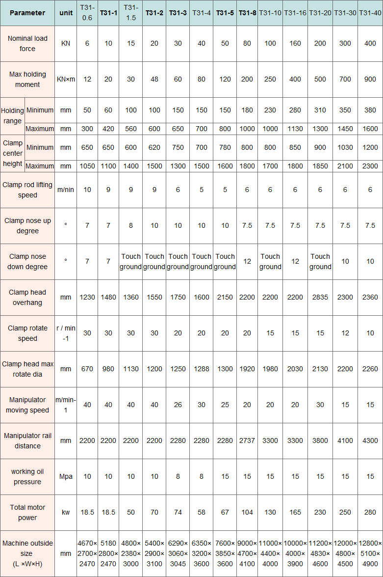 This series forging manipulator has whole hydraulic press and mechanism hydraulic press mixed etc drive types.It has manipulator walk,clamp pinch,the clamp head rotate.the clamp hold lifting,the clamp hold slant ,clamp hold turn back etc functions.It used to clamp axes kinds forged piece and blan k to cooperate with forging hammer to do forging work ,to reduce labour intensity of workers.to come true manufacturing mechanization of forged piece.